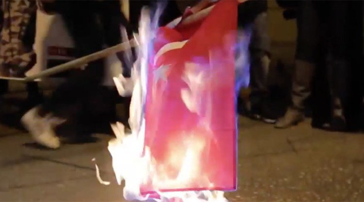 Οι διαδηλωτές έκαψαν Τουρκική και Αμερικανική σημαία και απαίτησαν η Ελλάδα να αποχωρήσει από το ΝΑΤΟ.
