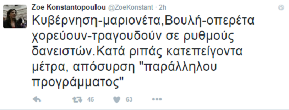 Με αναρτήσεις της σε facebook και Twitter το απόγευμα της Πέμπτης η κυρία Κωνσταντοπούλου έκανε λόγο για «κυβέρνηση-μαριονέτα» και «Βουλή-οπερέτα» που χορεύουν και τραγουδούν σε ρυθμούς δανειστών.