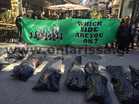 Κούμα στο κέντρο της Λάρισας, θέλοντας με αυτό τον μακάβριο τρόπο να υπενθυμίσουν το έγκλημα που διαπράττεται καθημερινά με την ανοχή της διεθνούς κοινότητας.