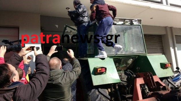 Οι αγρότες άφησαν άναυδους τους συναλασσόμενους καθώς ένα από τα τρακτέρ εισέβαλε από την κεντρική είσοδο της εφορίας.
