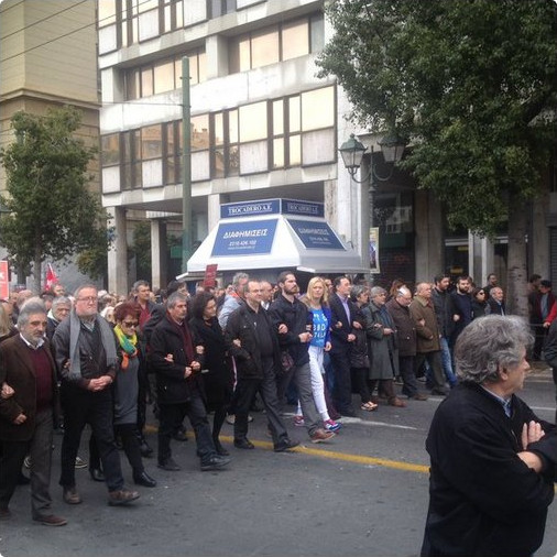 Στην πρώτη γραμμή του μπλοκ της Λαϊκής Ενότητας, πιασμένοι αγκαζέ με τον Παναγιώτη Λαφαζάνη, οι Ραχήλ Μακρή, η Νάντια Βαλαβάνη, ο Δημήτρης Στρατούλης ο Κώστας Ησυχος και άλλοι.