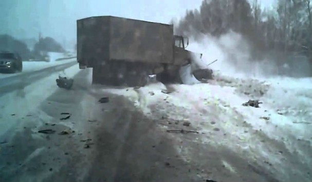 Το περιστατικό συνέβη σε εθνικό δρόμο της Ρωσίας, ο οποίος ήταν χιονισμένος. Η dashcam κάμερα στο μπροστινό μέρος ενός αυτοκινήτου δείχνει μπροστά του ένα φορτηγό.