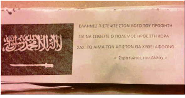 Το μήνυμα αυτό έγραφε τα εξής: ‘Έλληνες πιστέψτε στον λόγο του προφήτη για να σωθείτε. Ο πόλεμος ήρθε στη χώρα σας. Το αίμα των απίστων θα χυθεί άφθονο». Τα φυλλάδια έφεραν την υπογραφή, «Στρατιώτες του Αλλάχ». (πηγή ΚΑΤΑΝΥΞΗ)