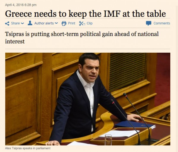 Κατά τους FT αν είναι αληθές ότι η ελληνική κυβέρνηση «μηχανεύτηκε» την κρίση σε μια προσπάθεια να αποβάλει το ΔΝΤ από το ελληνικό πρόγραμμα τότε «οι τακτικές της είναι ανεύθυνες».