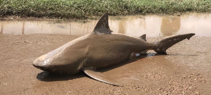 Μετά τη δημοσιοποίηση από τις υπηρεσίες διάσωσης της φωτογραφίας ενός τεράστιου καρχαρία μπουλντόγκ που είχε ξεβραστεί σ' έναν δρόμο, οι αρχές της Κουίνσλαντ προειδοποίησαν τον κόσμο για την πιθανή παρουσία φιδιών και κροκοδείλων.